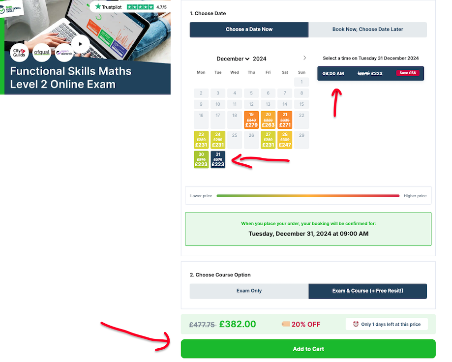 > Place an order as the Customer. For example, go to Functional Skills Level 2 exam, choose their date and time, and add to cart. Remember, from this point you have 20 minutes to complete the process before the reservation for this date and time runs out